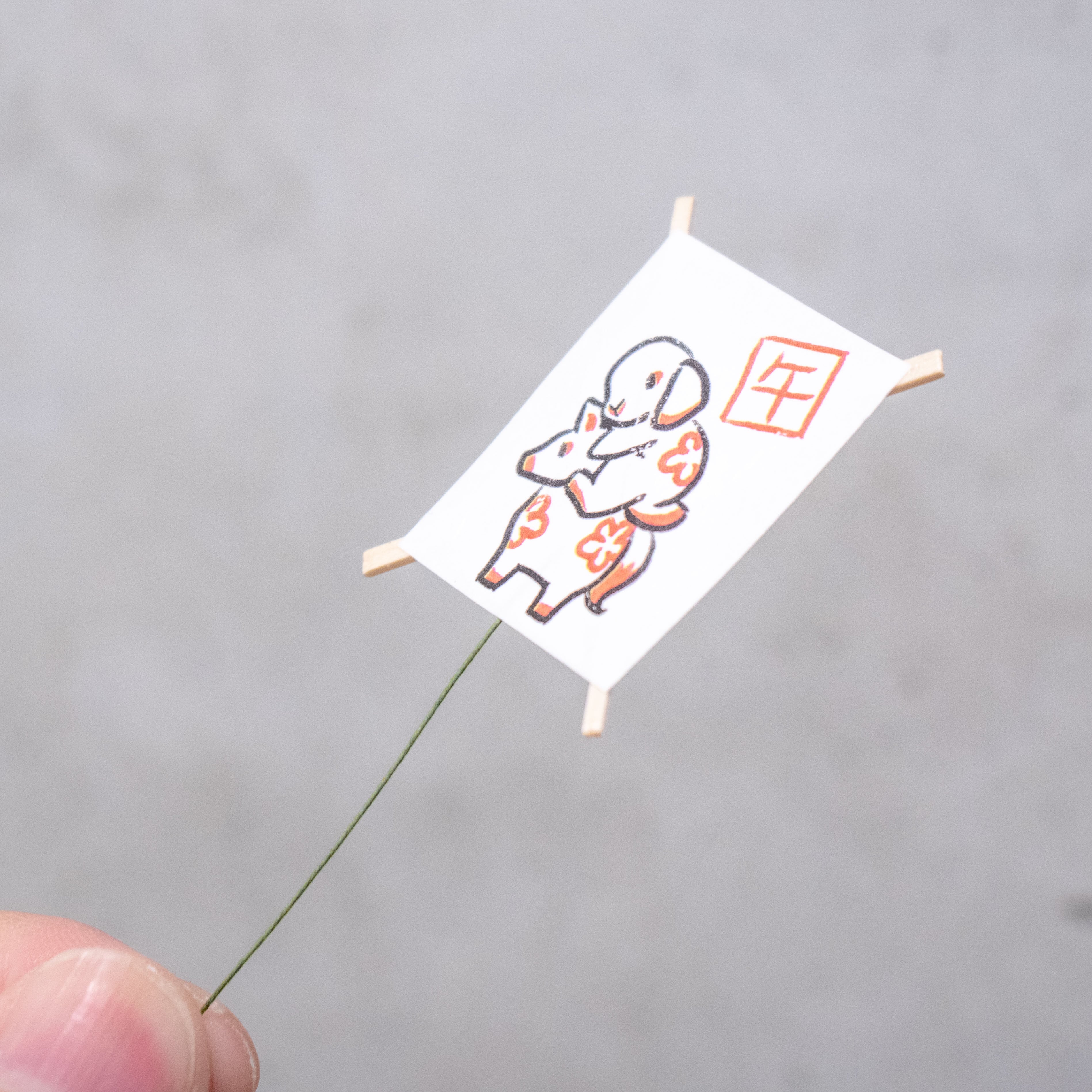 うさぎがウマに乗った可愛い凧のピックがついています。