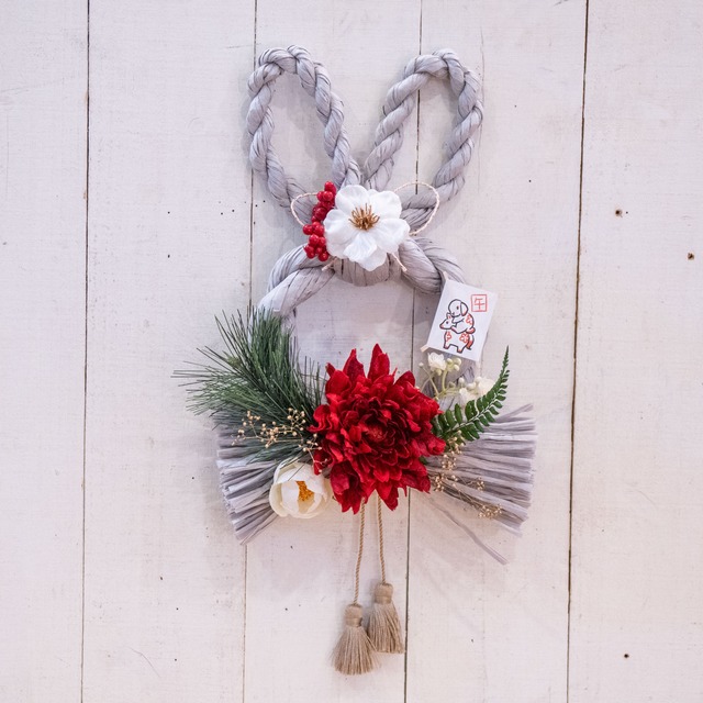兎結-usagi musibi-は、お正月の飾り付けにぴったりの可愛いアイテムです。しめ縄はお守りとしてもご利益があるとされています。 ロロットオリジナルのうさぎの形をした、しめ縄は伝統的な要素とユニークなデザインが組み合わさった作品です。新たな始まりを象徴し、ご家庭に幸運をもたらすことを願って制作しています。 2026年は午年です。うさぎクリエーターRYoが描いた うさぎがウマに乗った可愛い凧のピックがついています。 (たち耳、たれ耳のどちらかをお選びいただけます) 新年の門出を一緒にお祝いしましょう うさぎ好きさんへのプレゼントにもお喜びいただけます サイズ  縦:約28cm(タッセルを含む長さ約35cm) 横:約17cm タイプAとタイプBの違いは、メインの赤い花の形が違います。 ※室内用です。雨風に当たらないようご使用お願いいたします。 ※手作りのため、形や色味に多少の個体差がございます。予めご了承ください。 ※ドライフラワー(山シダ・ミニカスミゴールド)以外、アーティシャルフラワー使用 ※ お使いの端末や閲覧環境により、写真と実物の色味や質感が多少異なって見えることがございます。
